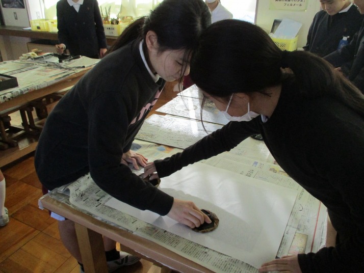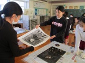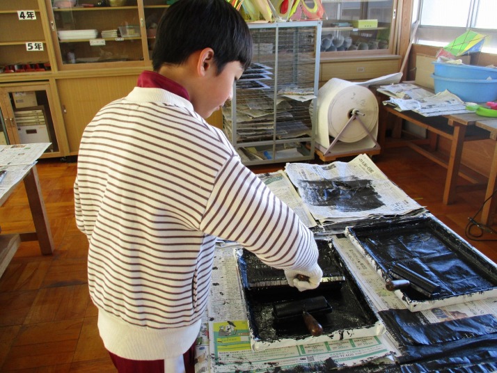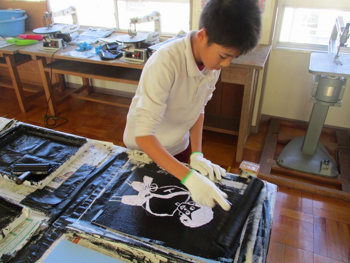 | 12月18日(木) 版画を刷っています。 各学年の図工の学習で取り組んでいた版画は、版画仕上がり印刷に入っています。高学年の作品も彫刻刀で版画板を彫りあげ、いい作品に仕上がっていました。 |