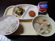| 12月1日(月) 今日の給食。ふくい名水サーモンポテト衣フライ 今日の給食の献立・・・ご飯、ふくい名水サーモンポテト衣フライ、大根と水菜のサラダ、ふくいのめぐみ汁、牛乳。エネルギー 613kcal タンパク質 24.7g |