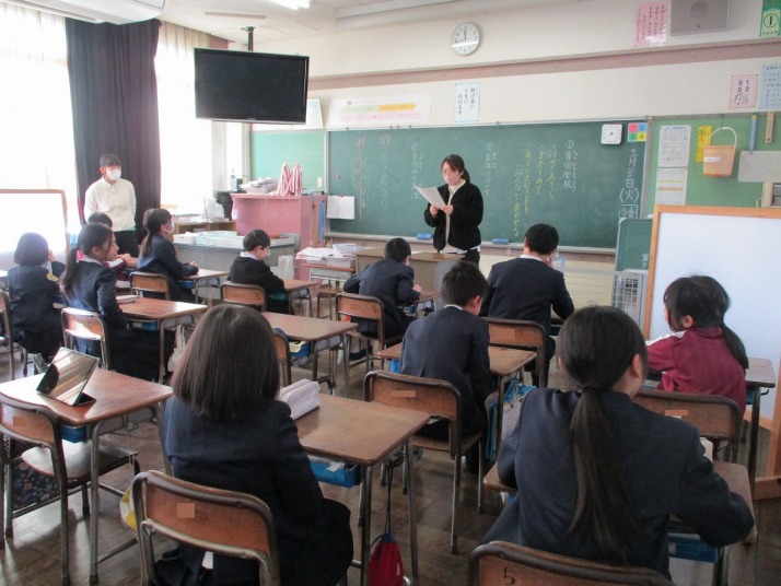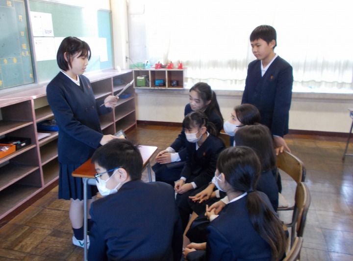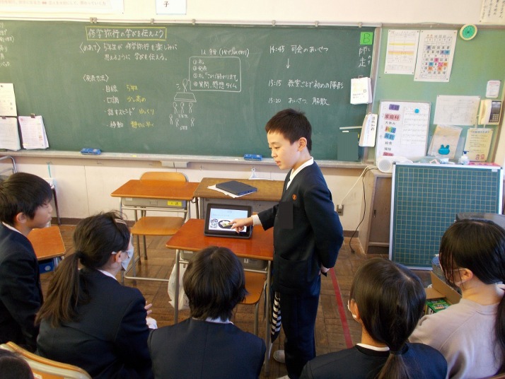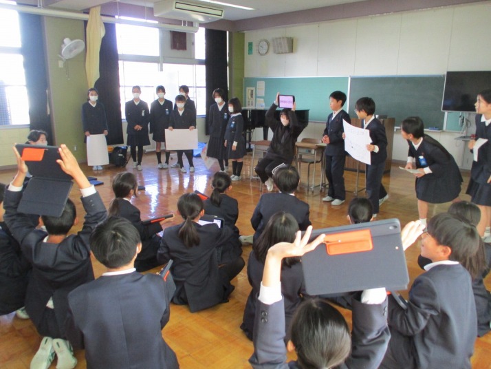 | 12月19日(金) 総合の発表をしました。 6年生はこれまで総合的な学習の時間に調べてきた主に修学旅行について5年生に発表をしました。他の学年も3年生は2年生に東郷地区のことを、4年生は福祉について発表をしていく予定だそうです。下級性は、来年どんな学習をするのか、見通しがもてそうですね。 |