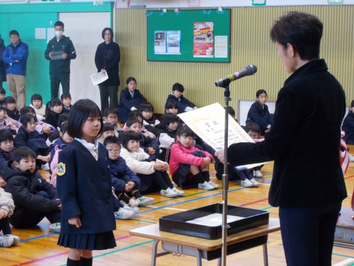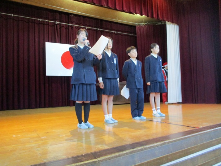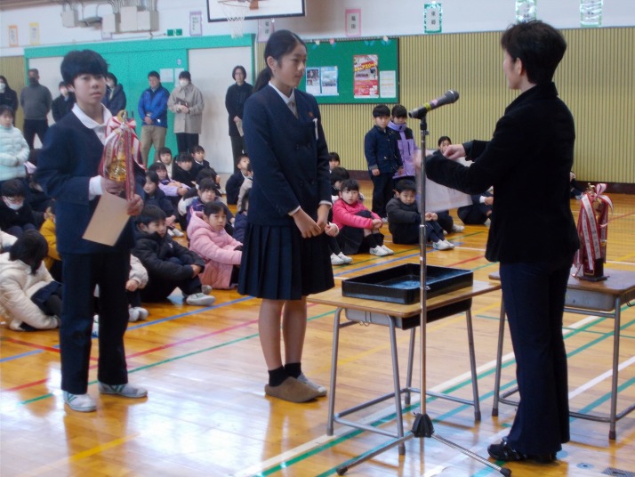 | 12月23日(火) 明日から冬休みです。 明日から冬休みの今日は、全校集会、町内子ども会、大掃除などがあり、教室では冬休みの過ごし方の話を聞いたりや冬休みの宿題などが配られたりしました。全校集会では、伝達表彰があり頑張りを全校でたたえました。また、校長先生からは、「1年を振り返り新しい年の目標をもちましょう」との話がありました。生徒指導の先生からは、冬休み中の過ごし方、ルールや約束などの話がありました。 皆さん、良いお年をお迎えください。 |