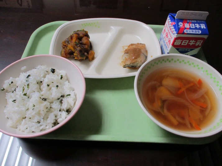 | 12月22日(月) 今日の給食。サワラのごま味噌だれ 今日の給食の献立・・・ご飯、サワラのごま味噌だれ、冬至なんきん、豆腐のすまし汁、牛乳。エネルギー623kcal タンパク質 28.1g |
