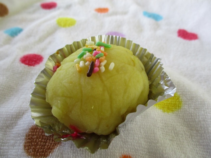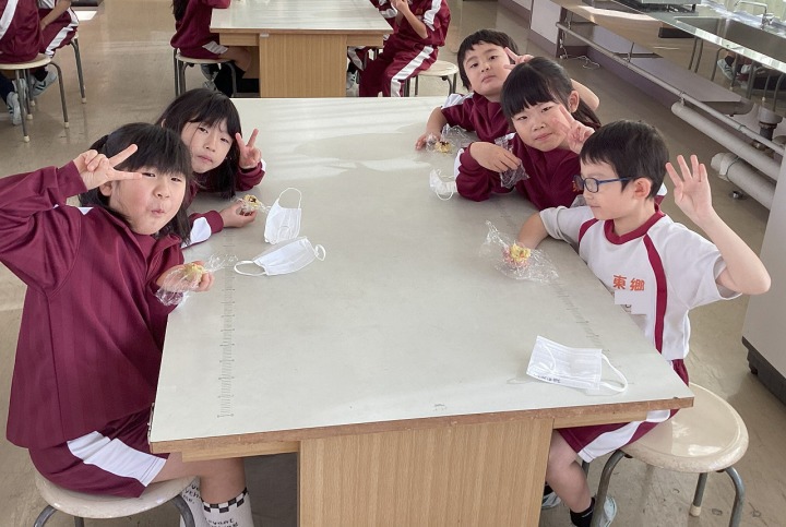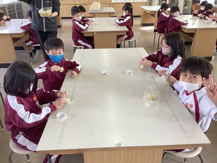 | 12月22日(月) おいもパーティーをしました。 1、2年生は、さつまいもを使ってスイートポテトを作りおいもパーティーをしました。潰したさつまいもをラップで丸くこね、アルミざらに移してホットプレートで焼きました。しばらくすると、さつまいものような甘い香りが・・・・。焼き上がったスイートポテトに色とりどりのチョコスプレーをちらしておいしくいただきました。 |