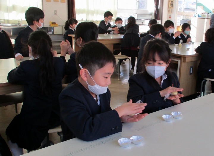 | 12月11日(木) 「味覚の授業」がありました 5年生の家庭科では、お店を持っておられるシェフをお呼びして味覚の授業が行われました。 五味に加え「うま味」があること、味は嗅覚などと連動して感じられること、味覚などは一人一人物差しが違い、みんな同じではないことなどをお話ししていただきました。東郷地区の養鶏場の卵を使ったマヨネーズづくりや作っていただいたマカロンを試食し、みんなで楽しく味覚について学びました。 |