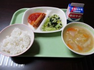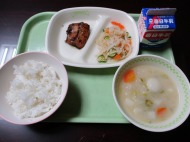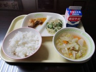 | 1月19日(月) 今日の給食。あじの和風だれかけ。 今日の給食の献立・・・ご飯、あじの和風だれかけ、野菜の炒め物、けんちん汁、牛乳。エネルギー531kcal タンパク質 26.9g |