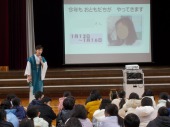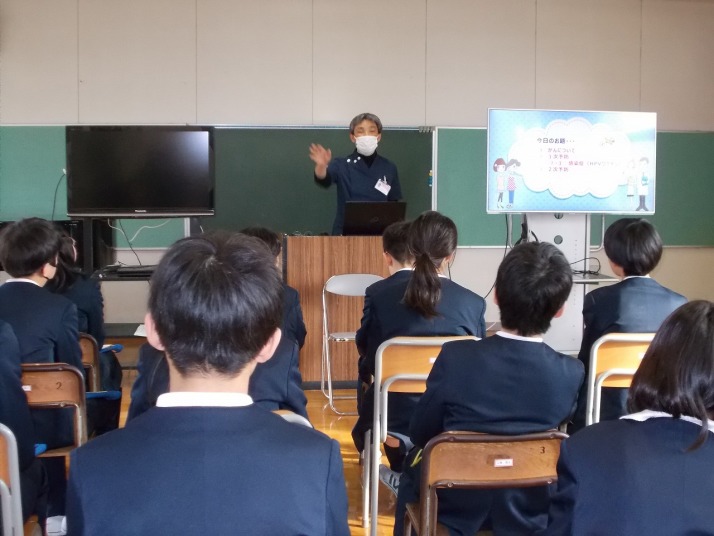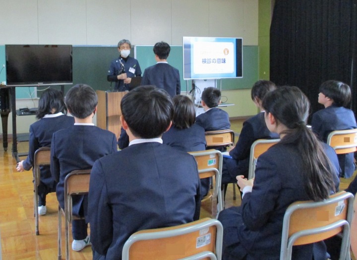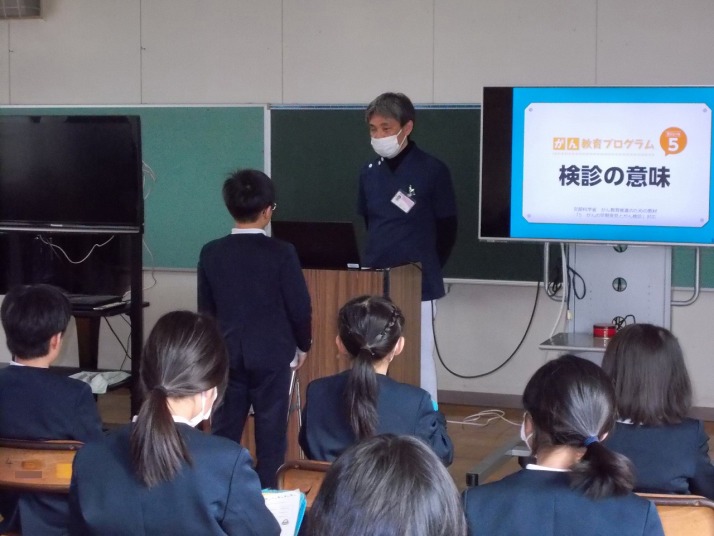 | 1月15日(木) がん教育がありました。 5,6年生の保健体育の授業では、学校医の福山医院 福山智基先生をお迎えして、がん教育が行われました。「がんは怖い病気だが、早期発見が大切であり、早期発見されると治る可能性が高くなる」「予防のために、野菜・果物を食べる、塩分を控える、運動をすることが大切」「がんの原因としては、喫煙、飲酒、感染症の割合が高い」等を教えていただきました。また、「子宮頸がんにはワクチン接種が有効である」「検診を受けることが早期発見につながる」事なども教えていただきました。福山先生ご自身の経験から、「これまで悔しい思いをされてこられた多くの患者さんと向き合ってきたので、みんなには悔しい思いをしてほしくない」とのお話を受けて、5,6年生からは、「早期発見すれば治ると聞いて、早めに検診を受けたい」等の声が聞かれました。 |