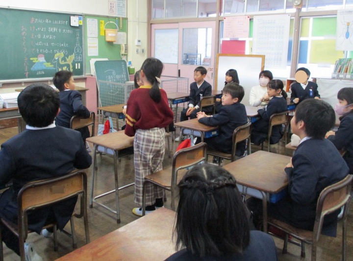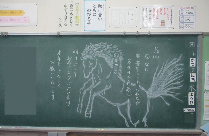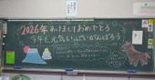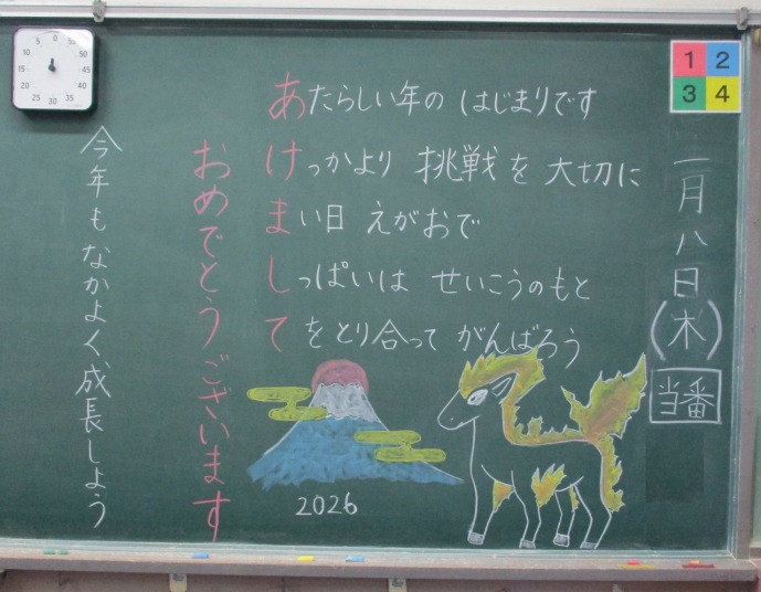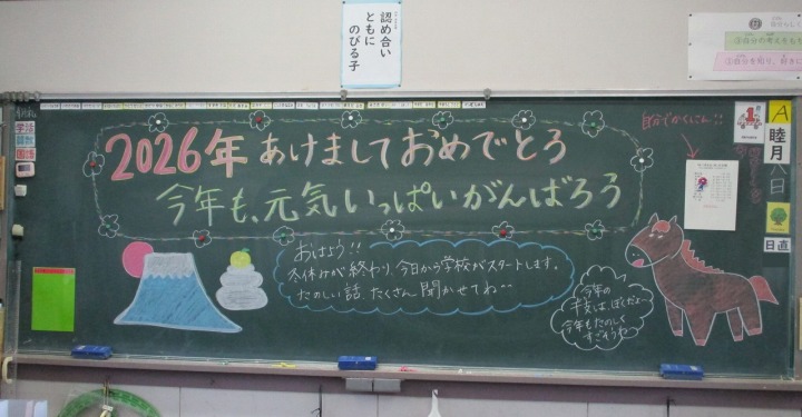 | 1月8日(木) 学校再開! あけましておめでとうございます。 冬休みが明け、2学期後半が始まりました。今日はまず大掃除をし、その後全校朝礼、教室での宿題提出、新年の目標決めなどがありました。全校朝礼では、午年の話や目標を持つこと、残り約50日をどのように過ごすとよいかなどの話がありました。またワーケーションで東郷地区に滞在するお子さんの受け入れについても話がありました。学級では、冬休みの思い出話をしたり、新しい年、次の学年への目標決めをしたり、国語辞典で干支について調べたりなどしました。休み時間には、体育館で1年生が元気よく鬼ごっこをするなど、静かだった校舎に賑やかな声が戻ってきました。 令和八年、ハッピーな年に、うま年にうまくいくようにがんばっていきましょう。今年もどうぞよろしくお願いいたします。 |