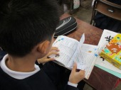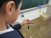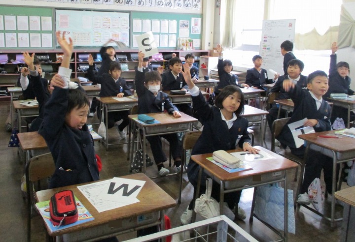 | 1月9日(金) 学習も再開されています。 冬休み明け2日目。授業も通常運転です。1年生は、わくわく交流デーに子ども園の皆さんに楽しんでもらおうとおもちゃを作っていました。色々と楽しそうに確かめながらグループで協力していました。 3年生は、英語の学習でした。アルファベットのカードを持ちながら歌を歌い、歌にあわせてもっているカード挙げていました。リズムよくあげられたかな。 |