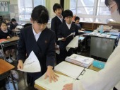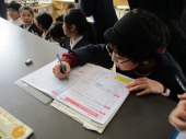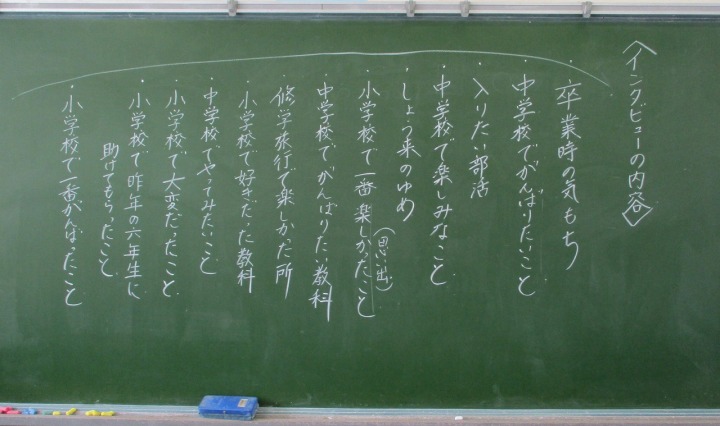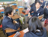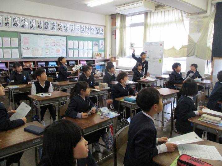| 1月30日(金) 総合的な学習では・・・ 各学年の総合的な学習もまとめを迎えています。3年生は、これまでの学習をまとめた発表会の練習をしていました。2年生に発表するそうで、「2年生はこの言葉わかるかな」など考えながら進めていました。4年生は卒業を祝う会時に「6年生にインタビュー」という役割があるので、どんな質問をしようかみんなで話し合っていました。 |