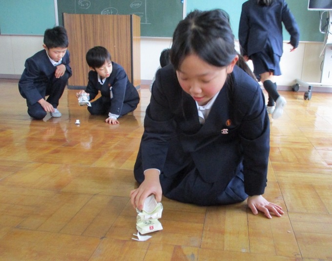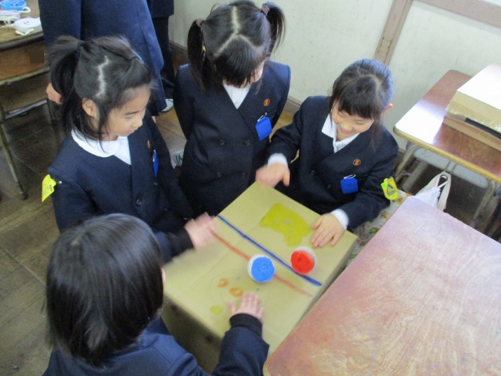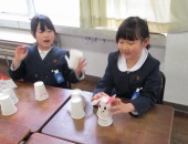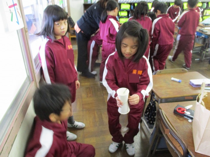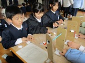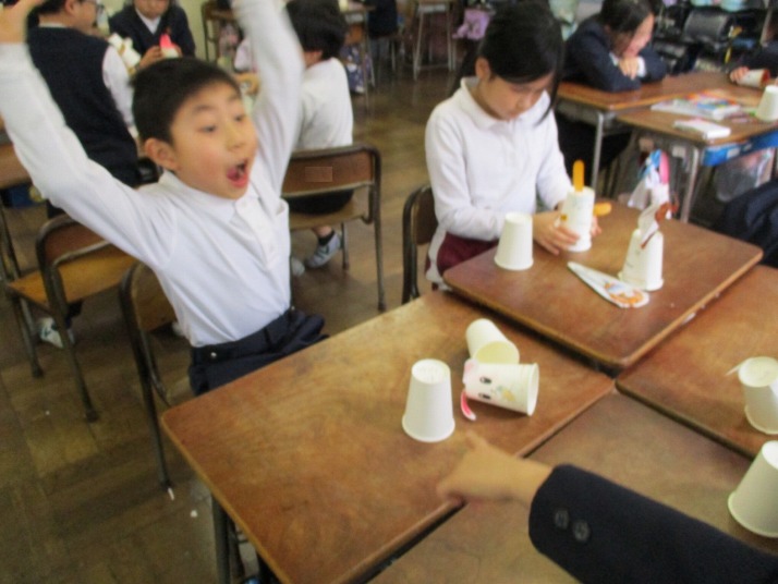| 1月21日(水) 楽しいおもちゃづくり。 2年生の図工では、紙コップを二つ重ねるとぴょーんとコップが飛ぶおもちゃを作っていました。今日は友達が作ったおもちゃをみんなで楽しみました。高く飛ぶコップにみんなびっくりしていました。 また、生活科で実施予定の「おもちゃランド」は、いよいよ今週末に迫ってきました。今日は、プレールームでリハーサルを行いました。お店屋さん(2年生)とお客さん(1年生)に別れて練習をしました。うまく1年生をお迎えできるよう頑張ってください! |