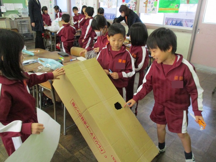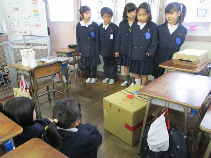 | 1月29日(木) わくわく交流デーに向けて。 1年生は、来週のわくわく交流デーに向けて、おもちゃの準備やおもちゃで遊んでもらうためのせりふや動きを確認していました。1年生が作ったおもちゃは段ボールや自然のものを使い大変ダイナミックな作りになっています。きっと子ども園の皆さんに喜んでもらえると思います。 |