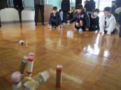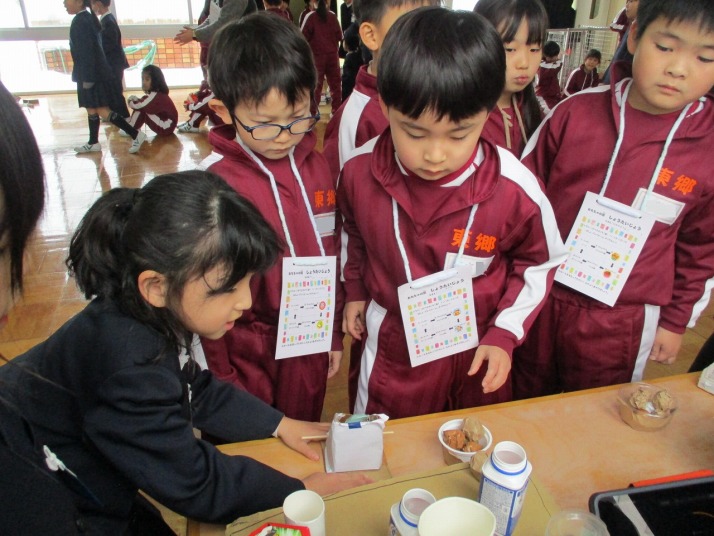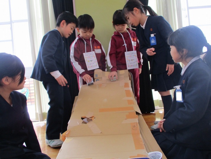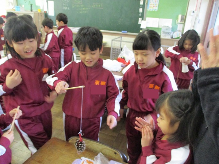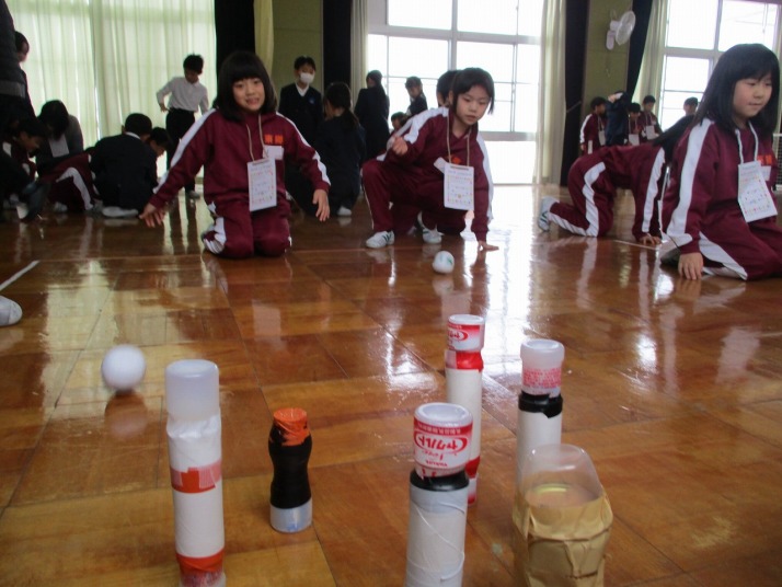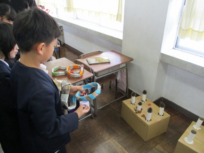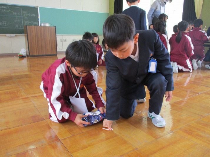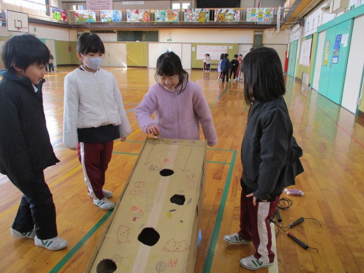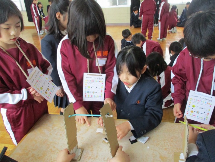 | 1月23日(金) おもちゃランド 楽しかったよ。 2年生がこれまで作ってきたおもちゃを1年生の皆さんに楽しんでいただくおもちゃランドが開かれました。2年生は、1年生に上手にやり方を説明したりアドバイスしたりしていました。1年生は笑顔で「2年生のおもちゃがおもしろかった」「ロケットが高く飛んで嬉しかった」「おもちゃがじょうずだった」など感想を発表していました。 |