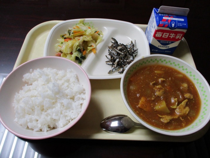 | 1月9日(金) 今日の給食。あつあげいりカレーシチュー。 今日の給食の献立・・・ご飯、あつあげ入りカレーシチュー、にぼしのごまからめ、小松菜のソテー、牛乳。エネルギー593kcal タンパク質 22.7g |