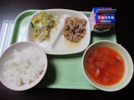 | 1月13日(火) 今日の給食。豚肉のアップルソース炒め。 今日の給食の献立・・・ご飯、豚肉のアップルソース炒め、キャベツとコーンのソテー、ミネストローネスープ、牛乳。エネルギー588kcal タンパク質 24.4g |