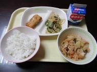 | 1月14日(水) 今日の給食。サワラの甘酢あんかけ。 今日の給食の献立・・・ご飯、サワラの甘酢あんかけ、切り干しとじゃがいもの煮物、キュウリの香りあえ、牛乳。エネルギー662kcal タンパク質 28.6g |