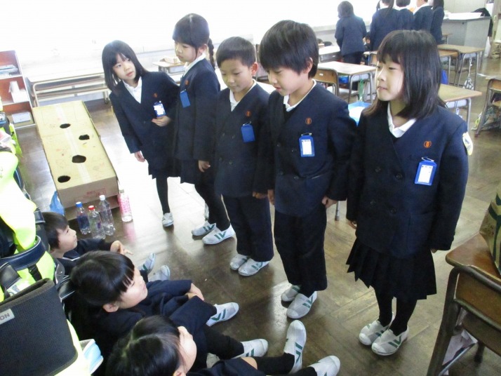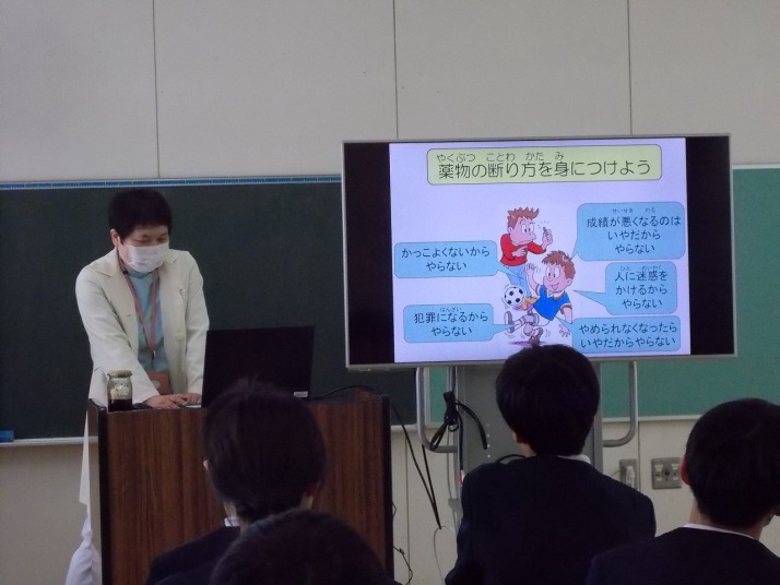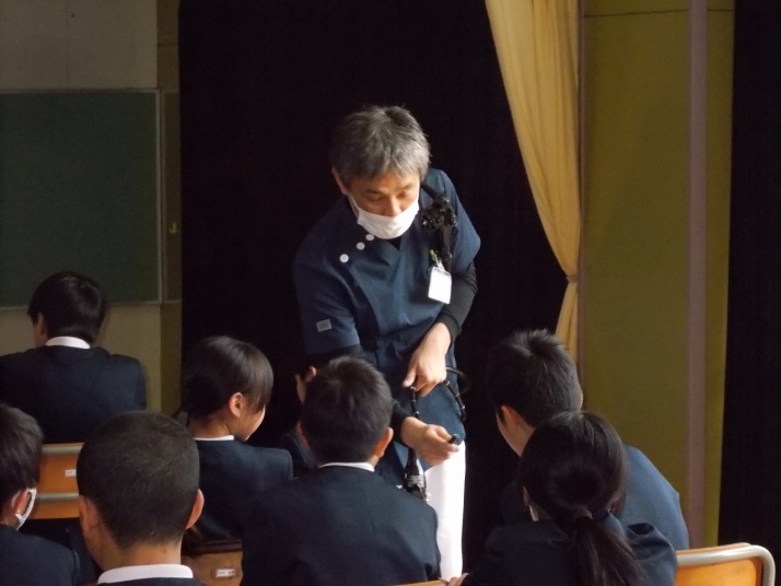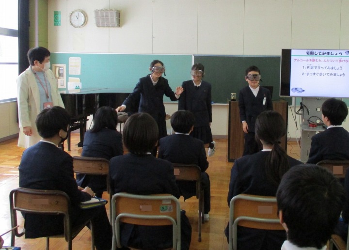 | 1月26日(月) 薬物乱用防止教室がありました。 6年生の保健体育の授業、学校薬剤師の先生をお招きした「薬物乱用防止教室」がありました。ルールを守った薬の飲み方やタバコやアルコールを摂取したときの影響を教えていただき、また、アルコールで酔った時の見え方を体験できるゴーグルをかけうまくまっすぐの歩けない体験をしました。そのほかに、薬物について種類や誘われたときの断り方等も教えていただきました。薬剤師のお仕事も教えていただき、これから生活していく上で参考になる時間でした。6年生からは、「薬物に手を出すと一生を棒に振るので、気をつける」「薬は飲む数や時間、回数に気をつけてのみたい」などの感想が聞かれました。 |