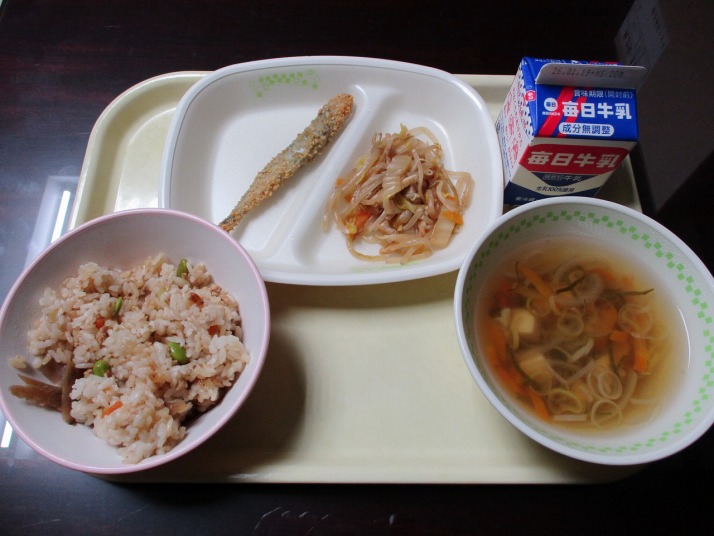 | 1月15日(木) 今日の給食。ししゃものカリカリ焼き。 今日の給食の献立・・・とりそぼろご飯、ししゃものカリカリ焼き、もやしの煮浸し、豆腐のすまし汁、牛乳。エネルギー566kcal タンパク質 24.2g |