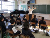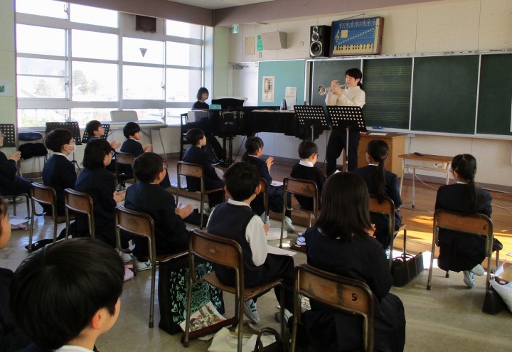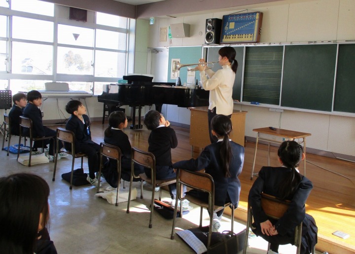 | 1月16日(金) トランペットの音色を聞こう 3年生の音楽は、今日は1,2組が合同で音楽室で行いました。「トランペット吹きの休日」(ルロイ・アンダーソン)という楽曲を鑑賞した後に、担任の先生が、実際にトランペットを見せてくださり、息の入れ方やピストンを押さえることでいろいろな音が出ることを教えてくださいました。その後、ピアノの伴奏に合わせ、トランペットで「さんぽ」を演奏してくださいました。とても素敵な時間で、こどもたちからは。「ブラボー!」の声が拍手と共にあがっていました。 |