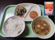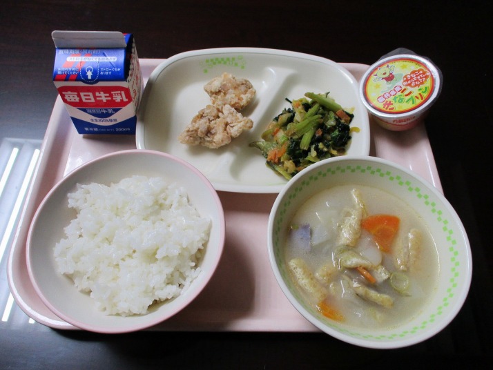 | 1月16日(金) 今日の給食。地場産プラスワン給食。 今日の給食の献立・・・ご飯、鶏肉のからあげ、青菜のごま和え、福井のめぐみ汁、きなこプリン、牛乳。エネルギー651kcal タンパク質 28.5g |