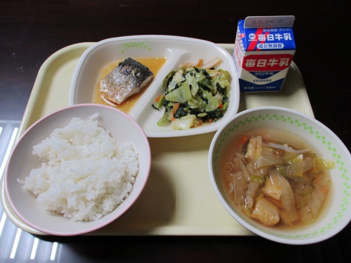 | 1月28日(水) 今日の給食。さばのみぞれ煮。 今日の給食の献立・・・ご飯、鯖のみぞれ煮、野菜のごま油炒め、さつまいもとあげの味噌汁、牛乳。エネルギー596kcal タンパク質 26.8g |