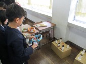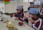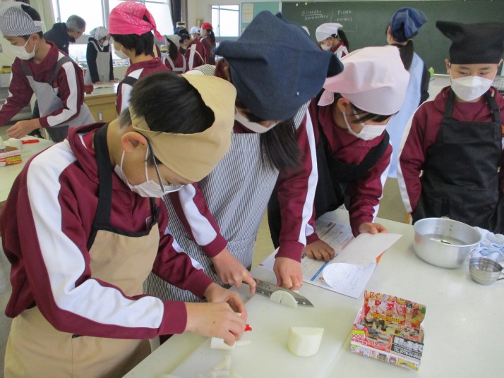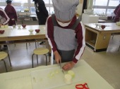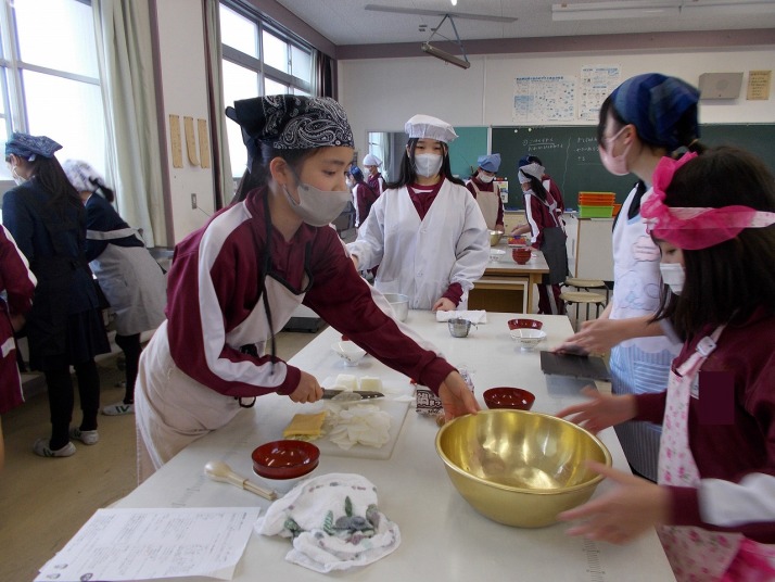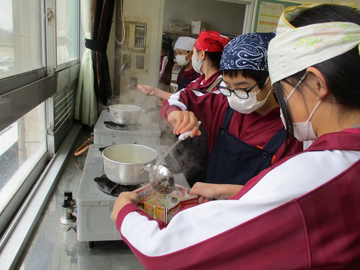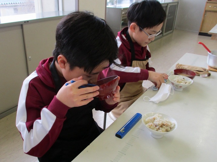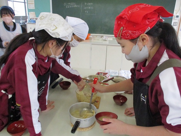 | 1月20日(火) ご飯とお味噌汁づくり。 5年生の家庭科では、調理実習でご飯を炊き、大根と揚げのお味噌汁を作りました。ご飯は、中身のみあるガラスの鍋を使い、ぐつぐつ沸騰するお米の様子を見ながら炊いていました。大根やネギを切ったり、煮干しの頭やわたを取ったり、味噌をといたりと、班で役割分担し協力しながら調理を進めていました。ご飯は少し焦げてしまいましたが、自分たちで作ったご飯と味噌汁をおいしくいただくことができました。 |