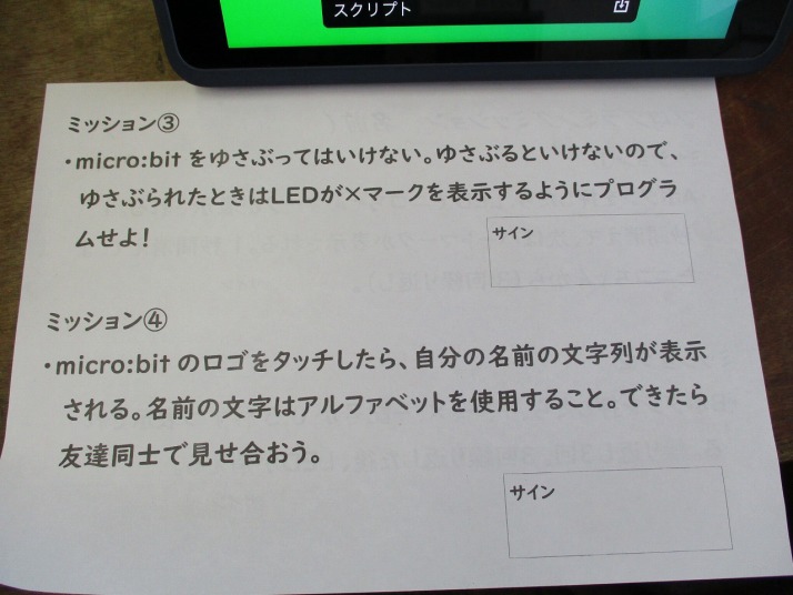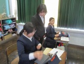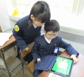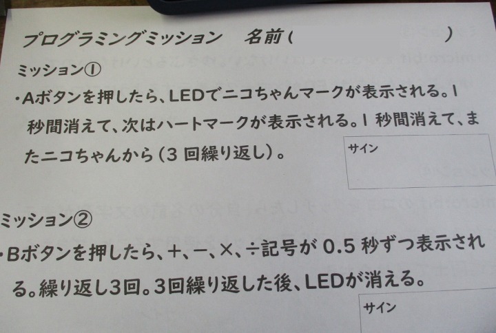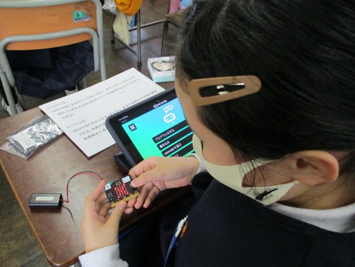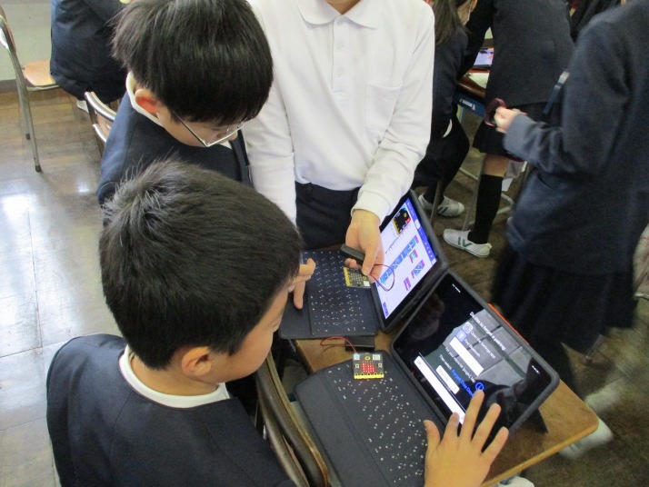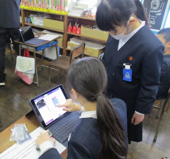 | 1月30日(金) プログラミング学習がありました。 5年生の総合の学習では、マイクロビットを活用したプログラミング学習がありました。大学生アシスタントの方にアドバイスをいただいたり友達どおし教えあったりして、4つのミッションをこなしていました。ミッションは、揺れたら「×」が表示されたり、自分の名前が表示されたり・・・みんな頭をフル回転させてプログラミングしていました。 |