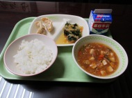 | 1月20日(火) 今日の給食。米粉あげぎょうざ。 今日の給食の献立・・・ご飯、米粉あげぎょうざ、海草と大根の中華和え、マーボー豆腐、牛乳。エネルギー683kcal タンパク質 25.9g |