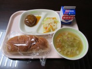| 1月26日(月) 今日の給食。かみもんコロッケ(上文殊地区で栽培されたしいたけ入りです)。 今日の給食の献立・・・ご飯、かみもんコロッケ、もやしのナムル、春雨スープ、牛乳。エネルギー580kcal タンパク質 17.5g (今日は、雪の影響で牛乳がいつもと異なる業者から、若干遅れて届きました。) |