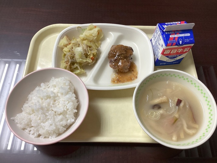 | 1月27日(火) 今日の給食。ハンバーグてりやきソース。 今日の給食の献立・・・パン、ハンバーグてりやきソース、レンコンサラダコンソメスープ、牛乳。エネルギー630kcal タンパク質 23.6g |