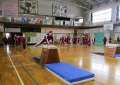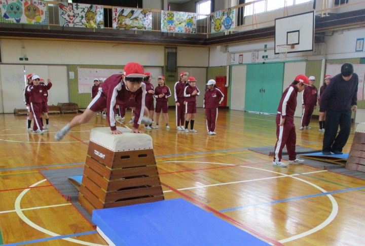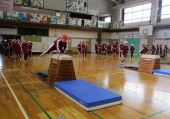 | 1月29日(木) 跳び箱 ぴょ~ん!。 4年生は、なわとび大会が終わった今日から器械運動、跳び箱に入りました。久々の跳び箱を前に、緊張した様子が見られましたが、慣れてくると次々と上手に踏み切って跳び越えている子、緊張してうまく跳びきれない子、それぞれに頑張って練習を繰り返していました。 |
