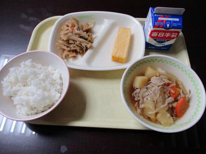 | 1月30日(金) 今日の給食。厚焼き卵。 今日の給食の献立・・・ご飯、厚焼き卵、根菜きんぴら、肉じゃが、牛乳。エネルギー638kcal タンパク質 25.9g |