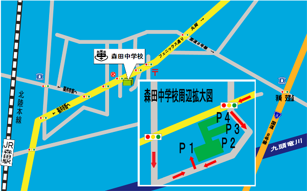 ※学校周辺は区画整理工事中のため、道路状況が変更されている場合がございます。