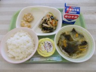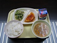 | 8月28日(木) 今日の給食。鶏の唐揚げ、あげの味噌汁 今日の給食の献立・・・ご飯、鶏の唐揚げ、小松菜の煮浸し、あげの味噌汁、牛乳。追加でプリン(卵乳大豆不使用)。エネルギー 608+α(プリン分) kcal タンパク質 20.3+α(プリン分) g ※本日のプリンは、7月11日(金)に「ごはん」の提供を中止した際の代替食品です。 |