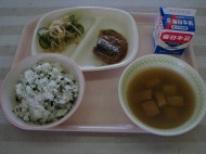 | 8月29日(金) 今日の給食。さばのみぞれ煮、わかめご飯 今日の給食の献立・・・わかめご飯、さばのみぞれ煮、キュウリの香り和え、のっぺい汁、牛乳。エネルギー 562 kcal タンパク質 26.8 g |
