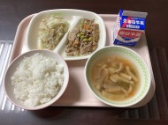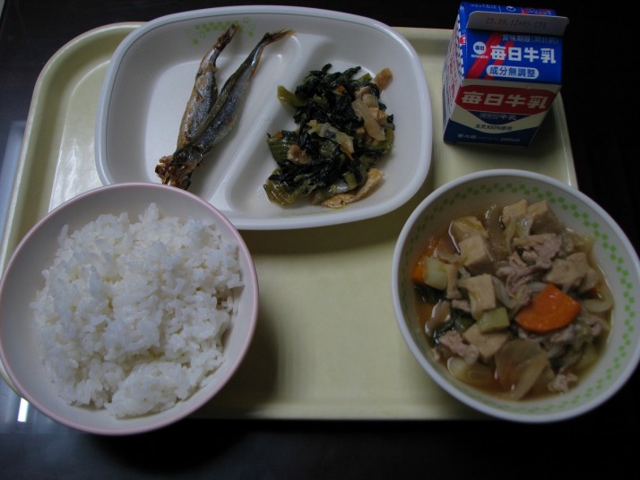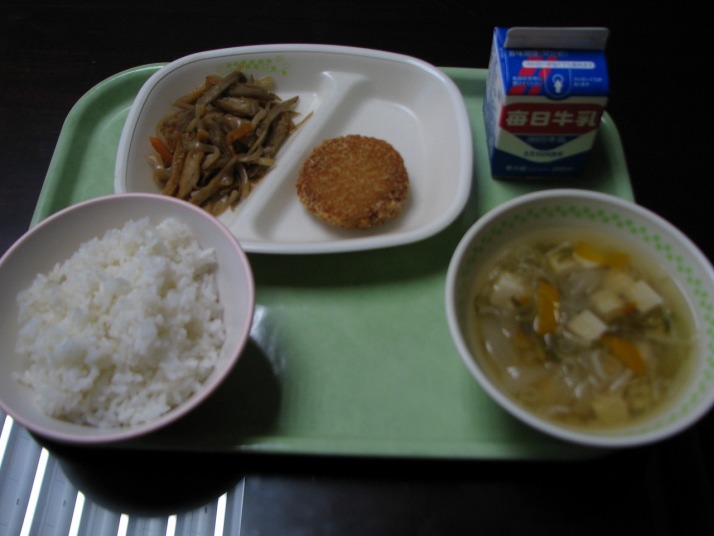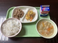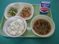 | 9月26日(金) 今日の給食。豚肉とゴボウの甘辛煮 今日の給食の献立・・・ご飯、豚肉とゴボウの甘辛煮、野菜の炒め物、根菜汁、牛乳。エネルギー 580kcal タンパク質 26.3g |