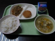 | 9月3日(水) 今日の給食。ポークコロッケ、五目きんぴらし 今日の給食の献立・・・ご飯、ポークコロッケ、五目きんぴら、豆腐のすまし汁、牛乳。エネルギー 612kcal タンパク質 21.3g |