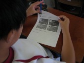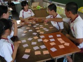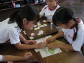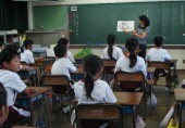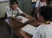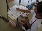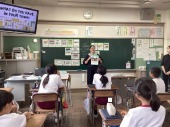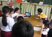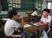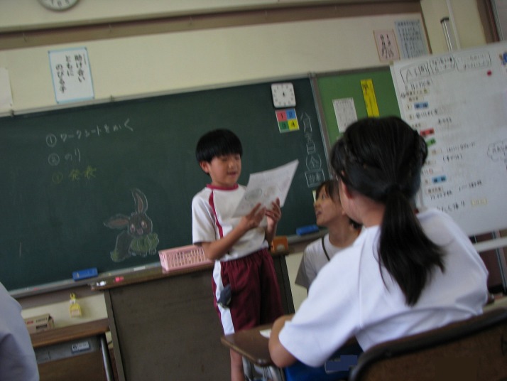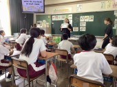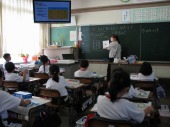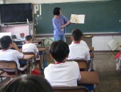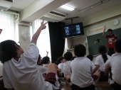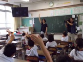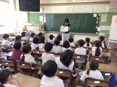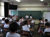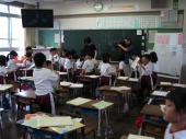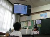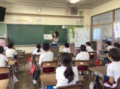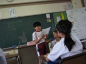 | 9月9日(火) Do you like ○○? 3年生の外国語活動は、「友達に好きな野菜やフルーツを聞く」ことでした。好きなものを聞くときの英語での言い方を教えていただき、早速みんなで聞きあっていました。上手にきけたかな。 |