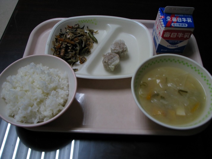 | 9月4日(木) 今日の給食。肉シュウマイ、打ち豆入りひじきの炒め煮 今日の給食の献立・・・ご飯、肉シュウマイ、打ち豆入りひじきの炒め煮、大根の味噌汁、牛乳。エネルギー 574kcal タンパク質 23.4g |