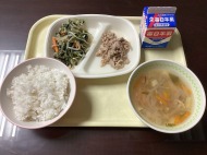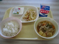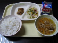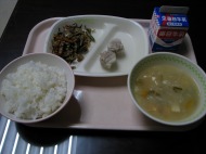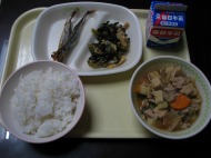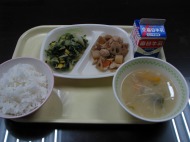 | 9月8日(月) 今日の給食。鶏肉とレンコンの煮物 今日の給食の献立・・・ご飯、鶏肉とレンコンの煮物、おひたし、豆腐の味噌汁、牛乳。エネルギー 534kcal タンパク質 23.9g |