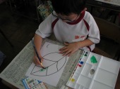 | 9月4日(木) 1年生 初めての絵の具 今日の1年生の図工では、小学生になって初めて絵の具を使っての活動となりました。パレットや水入れなどの道具の使い方やルールを確認してから、実際に葉っぱの形に色を塗ってみました。ドキドキわくわく、笑顔で活動をしていましたよ。 |