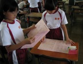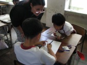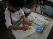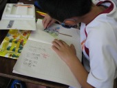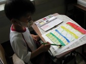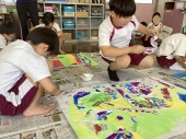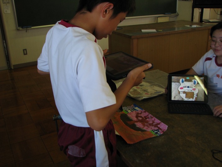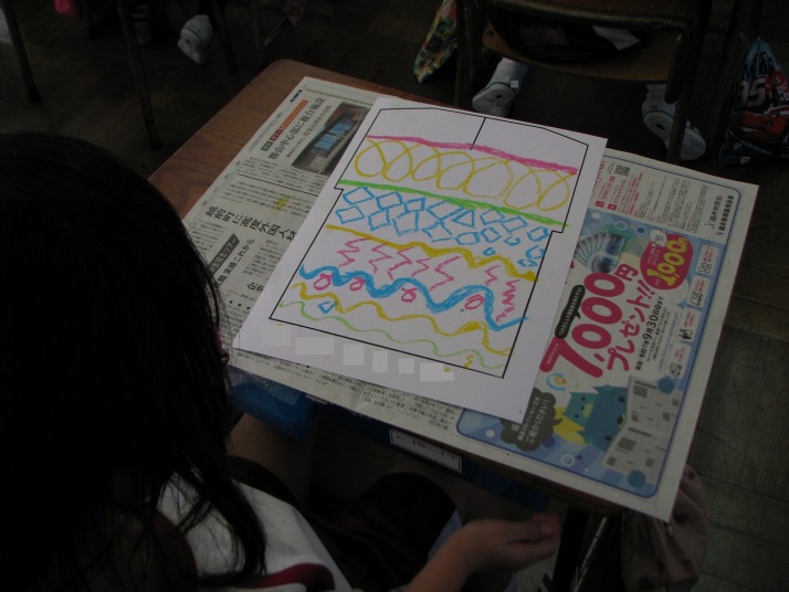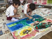 | 9月26日(金) 素敵な和紙を使った作品作り 3,4組さんの越前和紙を使った作品が仕上がりつつあります。今日は以前描いた絵を手でちぎり、背景に貼り付けていました。大胆で楽しい作品が仕上がりそうです。 |