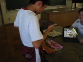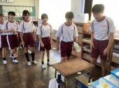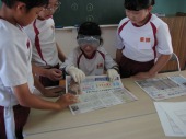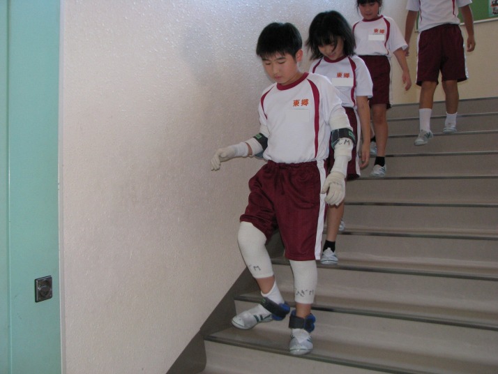 | 9月5日(金) 4年生、高齢者疑似体験をしました 4年生の総合の学習では、「福祉」をテーマに様々な視点から学習をしてきました。今月からはのテーマは「高齢者」です。今日は、高齢者疑似体験セットを装着して、体が重いことや思うように動かせないことなどを体験しました。今回の体験を元に、11月に行われる東郷公民館主催「ほのぼの運動会」の種目を考えていきます。 |