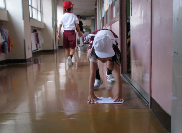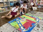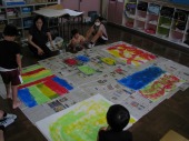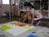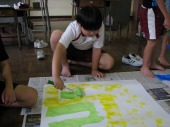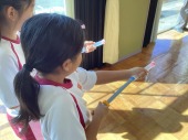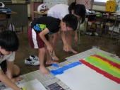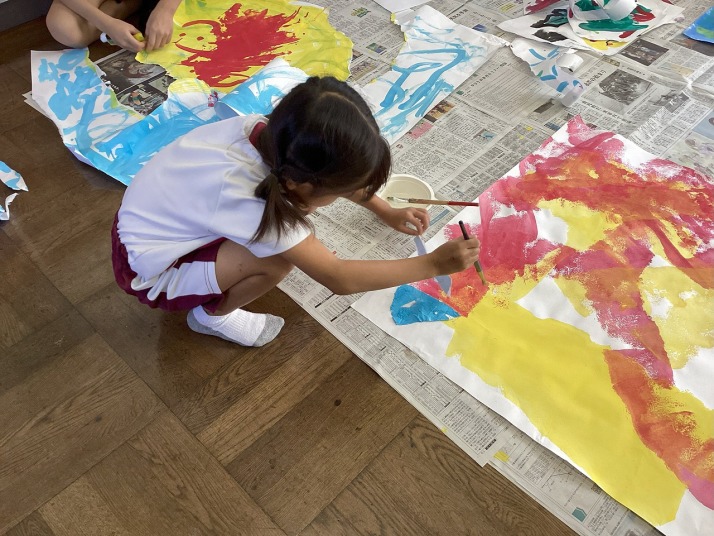 | 9月5日(金) ローラーコロコロ 今日の3・4組は、おおきな紙に絵の具の付いたローラーをコロコロ動かしてし「たのしい」を表現していました。今後、この絵を背景にして「たのしい」をテーマに絵を描いていくそうです。どんな絵ができるかな? |