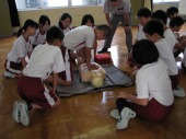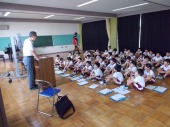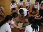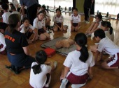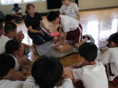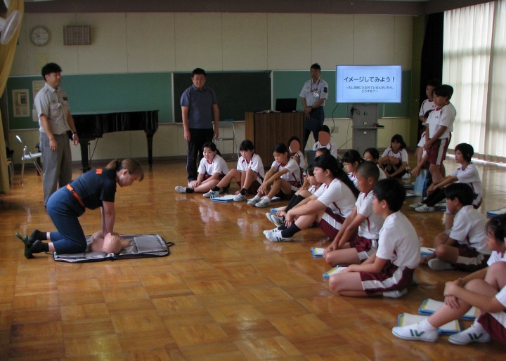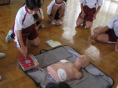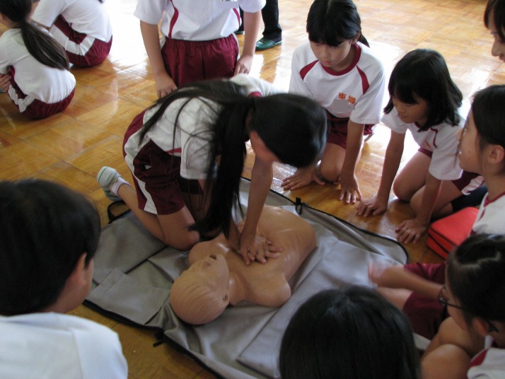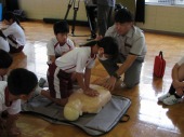 | 9月5日(金) BLS(Basic Life Support)教育 5,6年生の保健の学習として、かけがえのない命を大切に思い、心肺蘇生とAEDの基本を知るBLS教育が行われました。福井市東消防署東分署の救急救命士の方に心肺蘇生、AEDの重要性や意義を教えていただきその後はグループに分かれて実習を行いました。心肺蘇生時は、5Cmの深さまで両手で押すこと、1秒間に2階を基本として30回、1分間に100~120回心臓マッサージをすること、とにかくマッサージを続けることが大切 などを教えていただきました。また、「大切な人の命を守るために考えて工夫して行動してほしい」との話がありました。 |