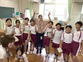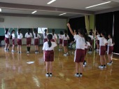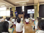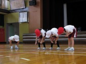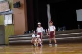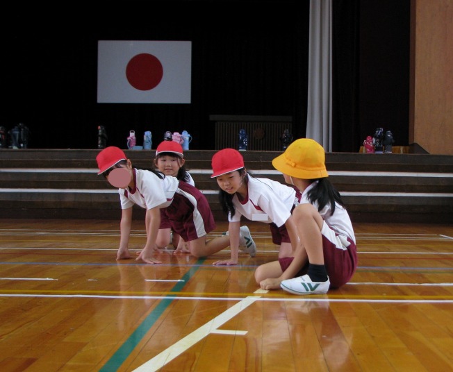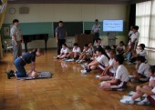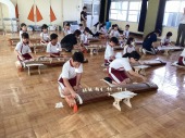 | 9月8日(月) 動物になりきろう 2年生の体育の学習は、「表現運動」です。グループに分かれて表現したい動物の1日をストーリー仕立てで表現します。今日はその中間発表。ちょっとはにかみながら、ライオンやペンギン、カンガルーなどグループで表現しました。発表後、もう少しスムーズにその動物らしく表現するためにもう少し練習することになりました。 |