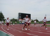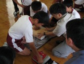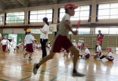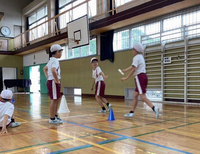 | 9月29日(月) リレーで大盛り上がり 3年生の体育では、体育館でリレーを行っていました。はじめは、バトンの受け渡しの練習や動きの確認をしました。その後は,実際に赤組対白組で対決です。回りの応援の声も大きくみんな一生懸命に走っていました。 |