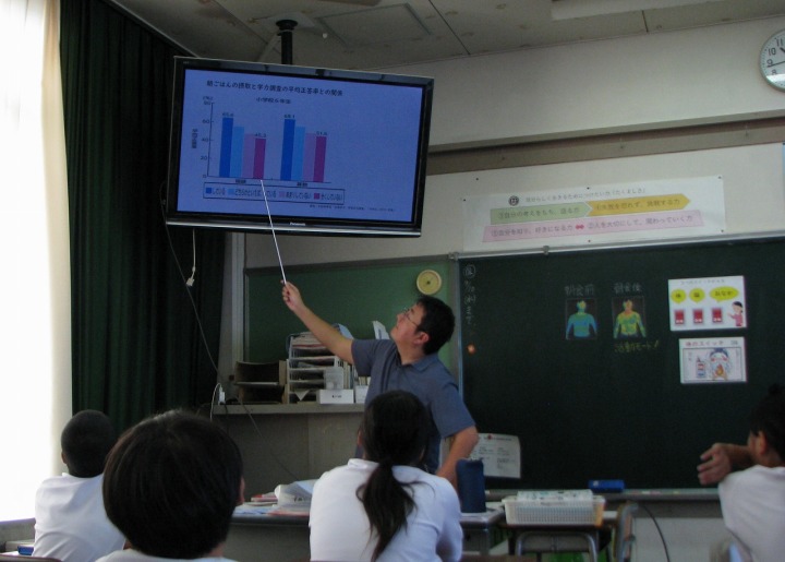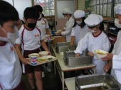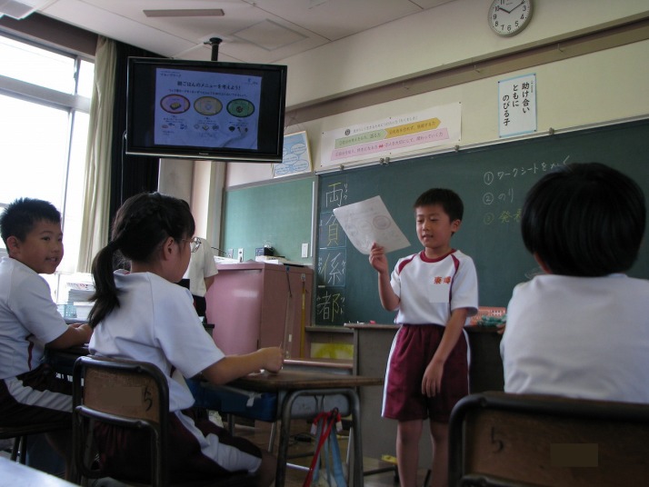 | 9月5日(金) 大切な朝ご飯 ~朝ご飯の役割~ 5年生の栄養指導では、朝ご飯の役割について教えていただき、自分の朝ご飯を振り返りました。朝ご飯には、3つのスイッチ、1:体のスイッチ(体温が上がり、元気に動ける)、2:脳のスイッチ(脳へのエネルギーになる)、3:おなかのスイッチ(排便ができ、気持ちよく登校できる)があるそうです。特に脳のスイッチでは、朝ご飯を食べた子と学力調査の関係がグラフで示され、朝ご飯の大切さをより実感することとなりました。また、栄養素を赤、黄、緑に分け、自分の朝ご飯の栄養素を振り返り、今後自分の朝ご飯をどうしたらよいのかを考えました。元気よく1日を過ごすために、しっかり朝ご飯を食べましょう。 |