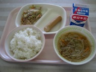 | 9月10日(水) 今日の給食。豚肉と野菜の中華いため 今日の給食の献立・・・ご飯、豚肉と野菜の中華炒め、ウインナー、ビーフンスープ、牛乳。エネルギー 612kcal タンパク質 26.5g |