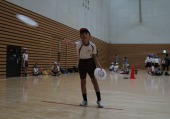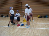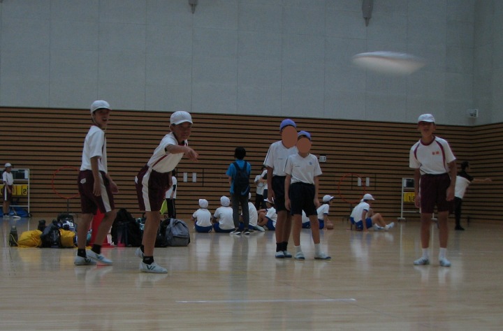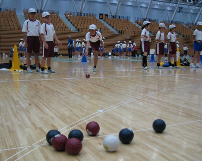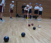| 9月1日(月) 3年生 モルックにチャレンジ 今日は、朝から気温が高く体育館での買うどうも難しいので、3年生は、エアコンのあるプレールームでモルックにチャレンジしました。モルックは、フィンランド発祥の「kyykkä」というゲームを基にしたスポーツで、木の棒(モルック)を投げて、並べられた数字付きの木製ピンを倒し合計得点を競うスポーツです。初めてチャレンジしましたが、ルールがわかってくると「あのピンを狙え!」「よっしゃー!」などアドバイスし合ったり歓声を上げたり。チームごとに協力し合って楽しむことができました。 |
