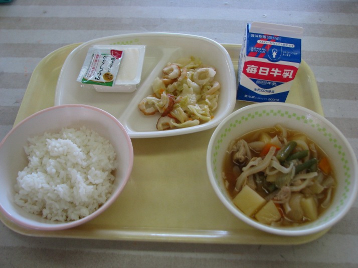 | 9月11日(木) 今日の給食。ちくわとキャベツの炒めもの 今日の給食の献立・・・ご飯、ちくわとキャベツの炒めもの、とうふ、一食だし醤油、にくじゃが、牛乳。エネルギー 574kcal タンパク質 24.2g |