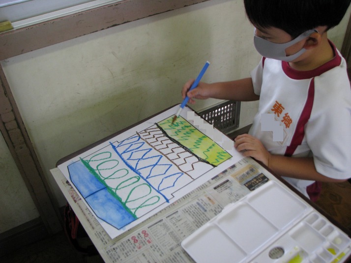 | 9月11日(木) カラフルポロシャツ きれいでしょ? 1年生の図工の時間では、前回絵の具の使い方を学習したので、今日は東郷地区ふれあい文化祭に展示する作品作りをしました。ポロシャツ型の画用紙にクレヨンで模様を描き絵の具で色をつけていくものです。みんなきれいな色を選び、筆で絵の具を塗ることができました。仕上がった作品は、東郷地区ふれあい文化祭での展示をお楽しみに! |